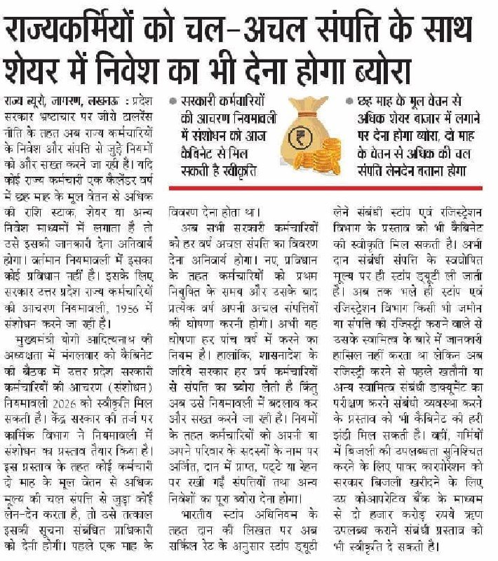 राज्यकर्मियों को चल-अचल संपत्ति के साथ शेयर में निवेश को भी देना होगा ब्यौरा March 10, 2026 by Jaswant Singh राज्यकर्मियों को चल-अचल संपत्ति के साथ शेयर में निवेश को भी देना होगा ब्यौरा